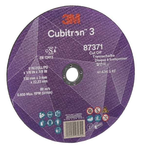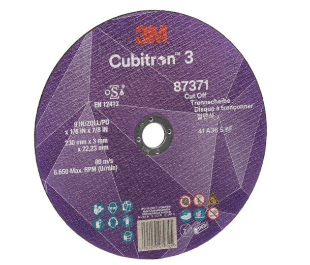 3M™ Cubitron™ 3 Cut-Off Wheel, 87371, 36+, T41, 230 mm x 3 mm x 22.23 mm (9 in x 1/8 in x 7/8 in), EN, 25/Pack, 50 ea/Case