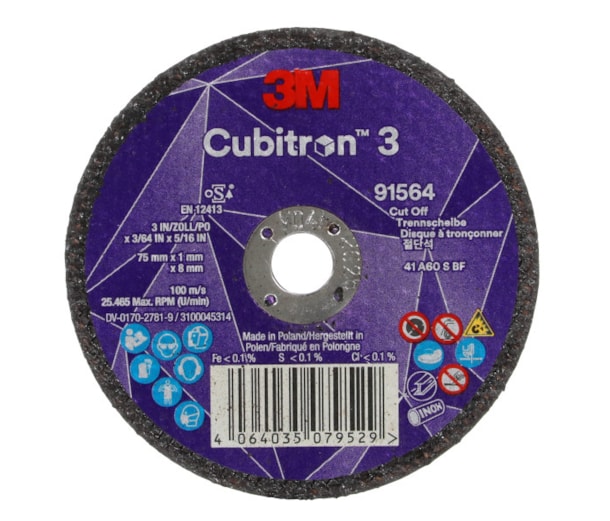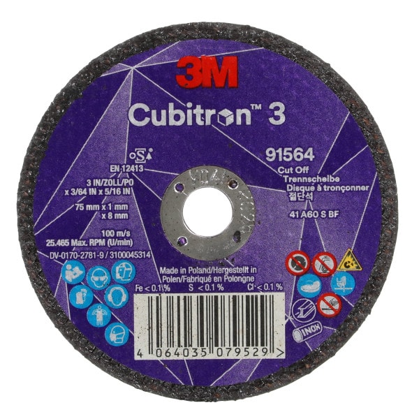 3M™ Cubitron™ 3 Cut-Off Wheel, 91564, 60+, T41, 75 mm x 1 mm x 8 mm, EN, 25/Pack, 50 ea/Case |