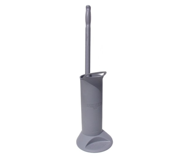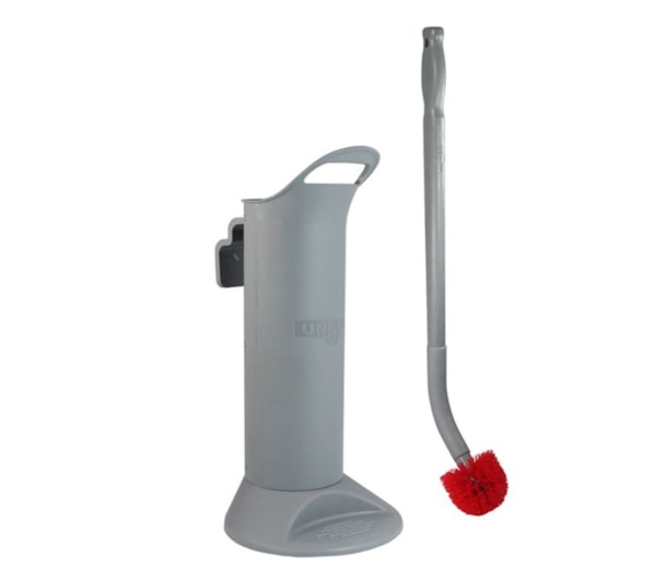 Escova WC com cabo curvo e suporte, solução prática e higiénica para limpeza de sanitários.